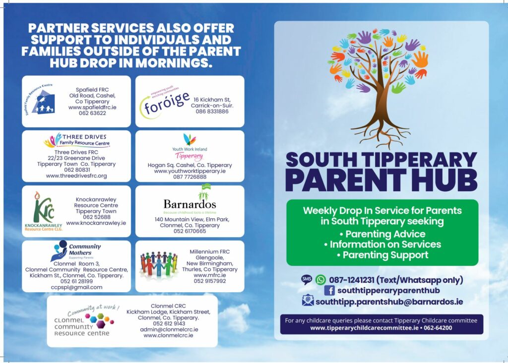 Parents can drop-in during this dedicated time to speak with the Parent Hub worker and request support, advice or signposting; they can also access this service via the Parent Hub phoneline  (087 1241231 text/whatsapp only but will get a call-back) or email (southtipp.parentshub@barnardos.ie)